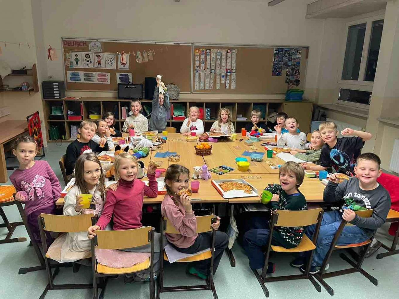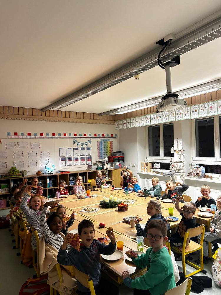 Natürlich durfte auch das gemeinsame Essen nicht fehlen: Es gab Pizza, warmen Punsch und viele leckere, mitgebrachte Kekse.